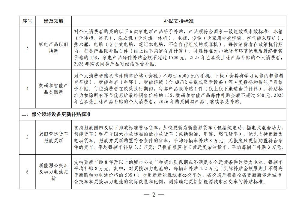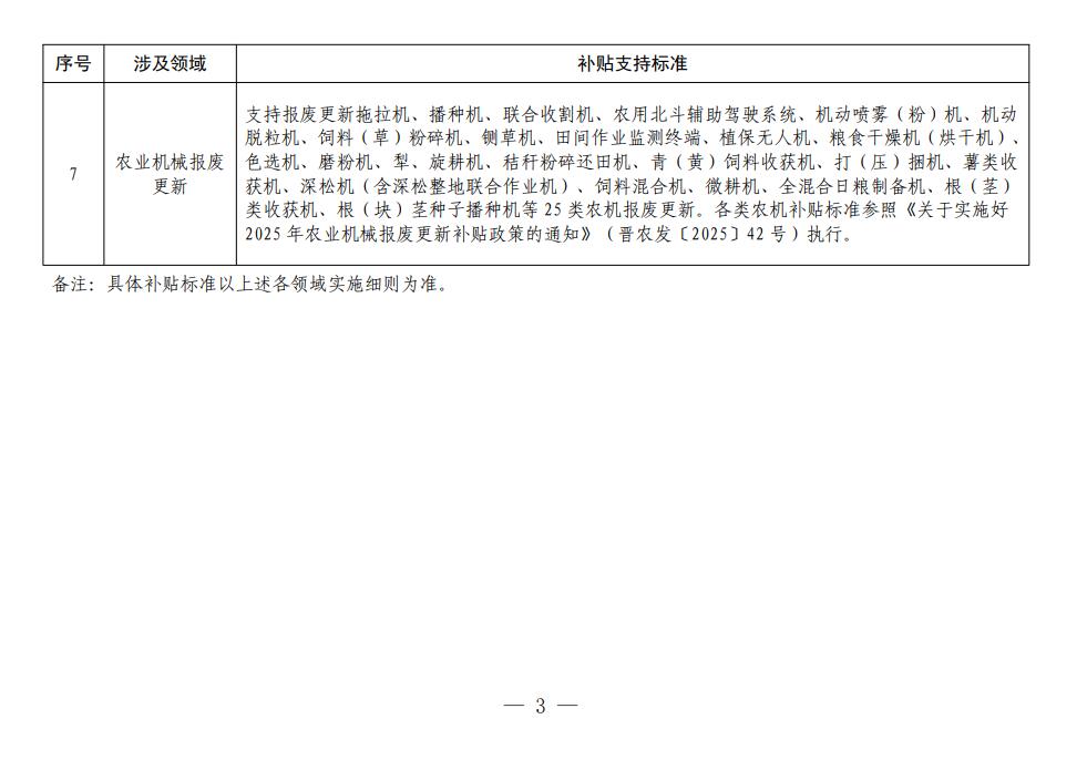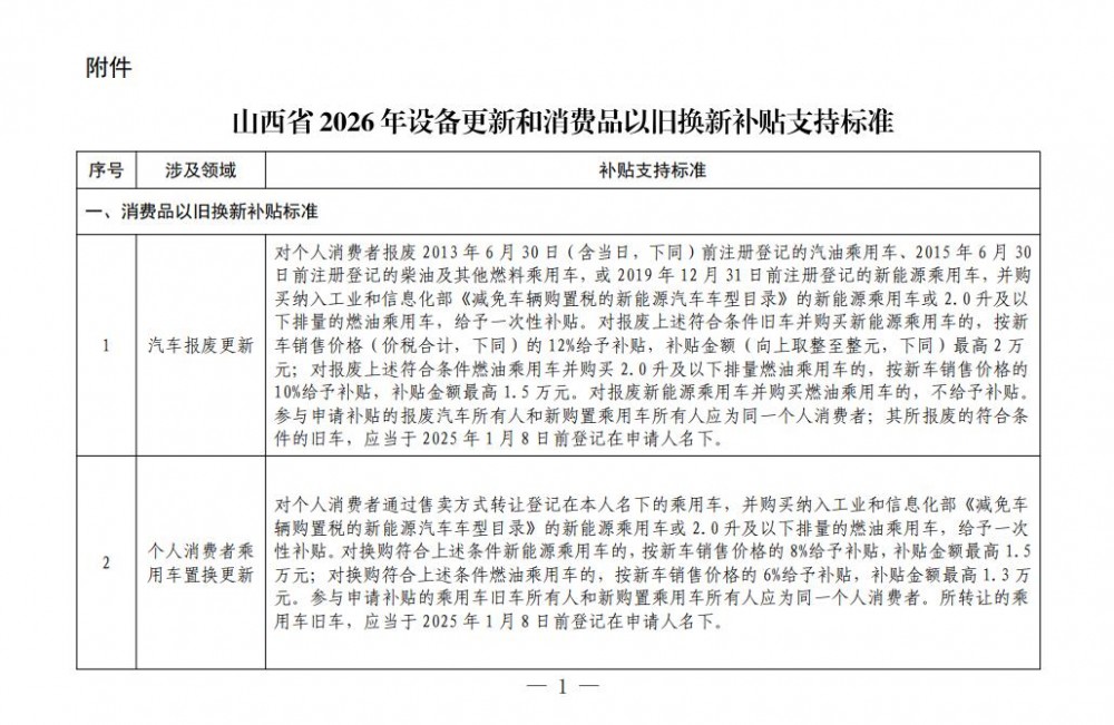 近日,山西省成长及鼎新委员会印发《山西省2026年实行年夜范围装备更新及消费品以旧换新政策步履方案》。 文件指出,深切推进营运货车、都会公交车及农机装备报废更新。继承鼓动勉励报废国四和如下排放尺度营运货车更新为低排放货车,优先撑持更新为电动货车,鞭策新能源重卡范围化运用,提高重点行业年夜宗货物清洁运输比例。鞭策都会公交车电动化替换,鼓动勉励公交企业成长绿色公交、聪明公交,撑持跨越质保期的动力电池安全有序改换。聚焦机播增产及机收减损,联合农业出产需要及农业机械化成长程度,撑持报废更新进步前辈合用、节能环保、安全靠得住的农业机械。以上范畴补助撑持尺度仍根据《山西省2025大哥旧营运货车报废更新事情实行细则》(晋走运管发〔2025〕123号)、《山西省2025年新能源都会公交车和动力电池更新补助实行细则》(晋交城客发〔2025〕90号)、《关在实行好2025年农业机械报废更新补助政策的通知》 原文件以下: 关在印发《山西省2026年实行年夜范围装备更新及消费品以旧换新政策步履方案》的通知 各市人平易近当局,省直有关部分: 《山西省2026年实行年夜范围装备更新及消费品以旧换新政策步履方案》已经经省当局赞成,现印发你们,请联合现实抓好贯彻落实。 山西省成长及鼎新委员会 山西省财务厅 2026年3月9日 山西省2026年实行年夜范围装备更新及消费品以旧换新政策步履方案 为周全贯彻党的二十年夜及二十届历次全会精力,当真落实《国度成长鼎新委财务部关在2026年实行年夜范围装备更新及消费品以旧换新政策的通知》(发改环资〔2025〕1745号)要求,连续推进我省年夜范围装备更新及消费品以旧换新,有力开释内需潜力、扩展有用投资,制订本方案。 1、周全推进年夜范围装备更新 (一)连续加年夜既有撑持范畴装备更新力度。继承加年夜工业、电子信息、能源电力、交通运输、物流、教诲、文旅、医疗、举措措施农业、粮油加工、安全出产、室第老旧电梯、节能降碳环保等范畴装备更新项目和收受接管轮回使用项目经营贮备力度。指导重点行业企业缭绕高端化、智能化、绿色化、安全化标的目的,加速裁减掉队低效、超期服役老旧出产线和高耗能装备,增强进步前辈设备及工艺推广运用。撑持现役煤机电组进级革新,晋升汽锅、机电等重点用能装备能效。有序鞭策冶金、建材等范畴推广运用电汽锅、电窑炉、电气装备等,提高终端用能电气化程度。推进新能源装备和电网举措措施更新。撑持更新矿山类、伤害化学品类等安全出产营救装备,晋升营救步队尺度化设置装备摆设程度。鞭策教诲、医疗等大众办事范畴举措措施装备进级,摸索进步前辈装备开放同享、高效使用等模式,晋升大众办事保障能力。(省成长鼎新委、省工信厅、省能源局、省教诲厅、省文旅厅、省卫生康健委、省农业屯子厅、省食粮及贮备局、省应急厅、省住建厅按职责分工卖力,各市人平易近当局抓好落实。如下均需各市人平易近当局落实,再也不逐一列出) (二)加速结构新增扩围撑持范畴装备更新项目。紧跟国度政策导向,缭绕国度2026年扩围撑持的老旧小区加装电梯、养老机构、消防营救举措措施、查验检测和线下消费贸易举措措施装备更新等范畴,加速行业调研及需求摸底,对于接国度政策精准经营一批成熟项目,更好满意平易近生及安全需要。重点推进既有室第加装电梯,完美适老化革新,利便住民出行。鞭策养老机构照顾护士床位、痊愈器械、安全监护、聪明治理等装备进级革新。撑持消防营救部分更新特种车辆、小我私家防护、智能营救等设备。鞭策查验检测机构引进进步前辈仪器,晋升技能办事能力,完美质量基础举措措施办事系统。鞭策社区零售贸易举措措施革新进级,鼓动勉励贸易综合体、购物中央、百货店、年夜型超市等线下消费贸易举措措施更新电梯、冷藏、照明等装备。聚焦伤害化学操行业安全出产,晋升出产存储运输举措措施装备的安全靠得住性,推广运用无人智能装备,增强进步前辈安全应急设备更新配备。(省成长鼎新委、省住建厅、省平易近政厅、省应急厅、省消防营救总队、省市场羁系局、省商务厅、省工信厅按职责分工卖力) (三)深切推进营运货车、都会公交车及农机装备报废更新。继承鼓动勉励报废国四和如下排放尺度营运货车更新为低排放货车,优先撑持更新为电动货车,鞭策新能源重卡范围化运用,提高重点行业年夜宗货物清洁运输比例。鞭策都会公交车电动化替换,鼓动勉励公交企业成长绿色公交、聪明公交,撑持跨越质保期的动力电池安全有序改换。聚焦机播增产及机收减损,联合农业出产需要及农业机械化成长程度,撑持报废更新进步前辈合用、节能环保、安全靠得住的农业机械。以上范畴补助撑持尺度仍根据《山西省2025大哥旧营运货车报废更新事情实行细则》(晋走运管发〔2025〕123号)、《山西省2025年新能源都会公交车和动力电池更新补助实行细则》(晋交城客发〔2025〕90号)、《关在实行好2025年农业机械报废更新补助政策的通知》(晋农发〔2025〕42号)履行。(省交通厅、省农业屯子厅牵头,省成长鼎新委、省财务厅、省生态情况厅、省公安厅、省商务厅共同) (四)增强项目及资金全链条治理。周全晋升项目治理效能,依托国度庞大设置装备摆设项目库,对于项