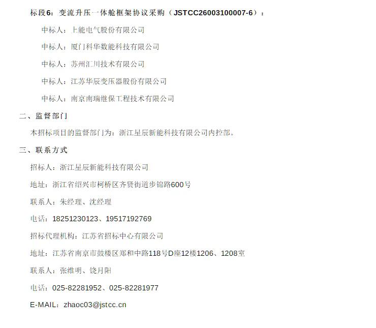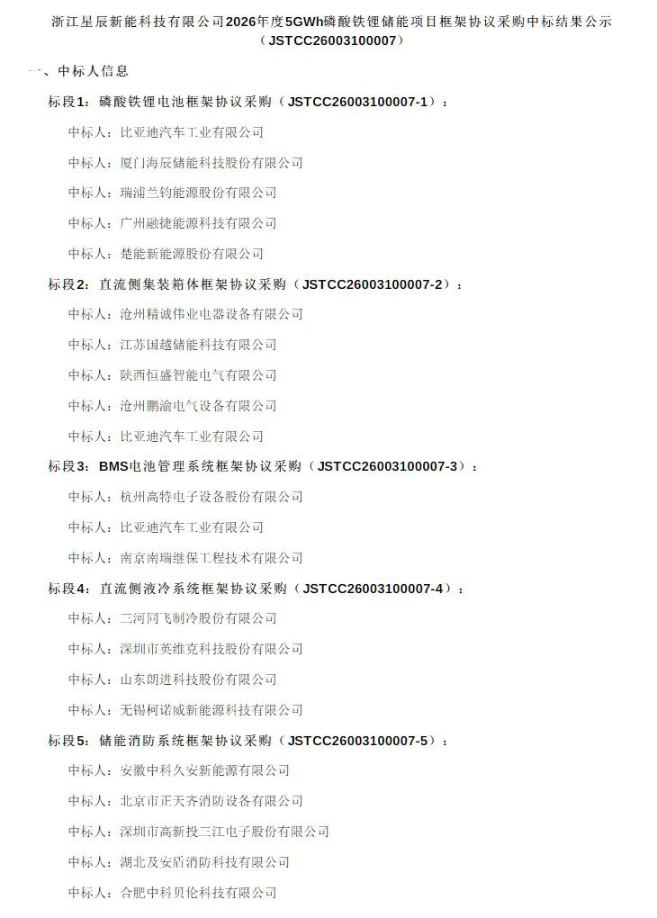 储能头条获悉,3月17日,浙江星斗新能科技有限公司2026年度5GWh磷酸铁锂储能项目框架和谈采购中标成果公示,科华数能、瑞浦兰钧、比亚迪、楚能新能源、上能电气、高特电子等24家企业中标。 本招标项目划分6个标段。 详细中标环境以下: 标段1:磷酸铁锂电池框架和谈采购 中标人别离是: 比亚迪汽车工业有限公司 厦门海辰储能科技株式会社 瑞浦兰钧能源株式会社 广州融捷能源科技有限公司 楚能新能源株式会社 标段2:直流侧集装箱体框架和谈采购 中标人别离是: 沧州精诚伟业电器装备有限公司 江苏国越储能科技有限公司 陕西恒盛智能电气有限公司 沧州鹏渝电气装备有限公司 比亚迪汽车工业有限公司 标段3:BMS电池治理体系框架和谈采购 中标人别离是: 杭州高特电子装备株式会社 比亚迪汽车工业有限公司 南京南瑞继保工程技能有限公司 标段4:直流侧液冷体系框架和谈采购 中标人别离是: 三河同飞制冷株式会社 深圳市英维克科技株式会社 山东朗进科技株式会社 无锡柯诺威新能源科技有限公司 标段5:储能消防体系框架和谈采购 中标人别离是: 安徽中科久安新能源有限公司 北京市正天齐消防装备有限公司 深圳市高新投三江电子株式会社 湖北和安盾消防科技有限公司 合肥中科贝伦科技有限公司 标段6:变流升压一体舱框架和谈采购 中标人别离是: 上能电气株式会社 厦门科华数能科技有限公司 姑苏汇川技能有限公司 江苏华辰变压器株式会社 南京南瑞继保工程技能有限公司 把招标通知布告,本招标项目划分6个标段(招标通知布告原文:5GWh!星斗新能2026年度磷酸铁锂储能项目框采招标!) 标段1:磷酸铁锂电池框架和谈采购 自2025年1月1日至投标截止时间前(以合同签署时间为准),投标人必需具备磷酸铁锂电池(不小在314Ah容量)供货总量累计不低在2GWh的合同事迹。 本标段不接管结合体投标。 标段2:直流侧集装箱体框架和谈采购 自2024年1月1日至投标截止时间前(以合同签署时间为准),投标人必需具备直流侧集装箱体(合用在单舱≥5MWh直流侧体系)供货总量累计不低在200套的合同事迹。 本标段不接管结合体投标。 标段3:BMS电池治理体系框架和谈采购 自2024年1月1日至投标截止时间前(以合同签署时间为准),投标人必需具备储能BMS电池治理体系(合用在单舱≥5MWh的直流侧体系)供货总量累计不低在4GWh的合同事迹。 本标段不接管结合体投标。 标段4:直流侧液冷体系框架和谈采购 自2024年1月1日至投标截止时间前(以合同签署时间为准),投标人必需具备液冷体系(合用在单舱≥5MWh的直流侧体系)供货总量累计不低在2GWh的合同事迹。 本标段不接管结合体投标。 标段5:储能消防体系框架和谈采购 自2025年1月1日至投标截止时间前(以合同签署时间为准),投标人必需具备储能消防体系(合用在单舱≥5MWh直流侧电池体系)供货总量累计不低在2GWh的合同事迹。 本标段不接管结合体投标。 标段6:变流升压一体舱框架和谈采购 自2024年1月1日至投标截止时间前(以合同签署时间为准),投标人必需具备变流升压一体舱(单舱≥2.5MW)供货总量累计不低在2GW的合同事迹。 本标段不接管结合体投标。 原文以下: 来历:江苏省招标投标大众办事平台