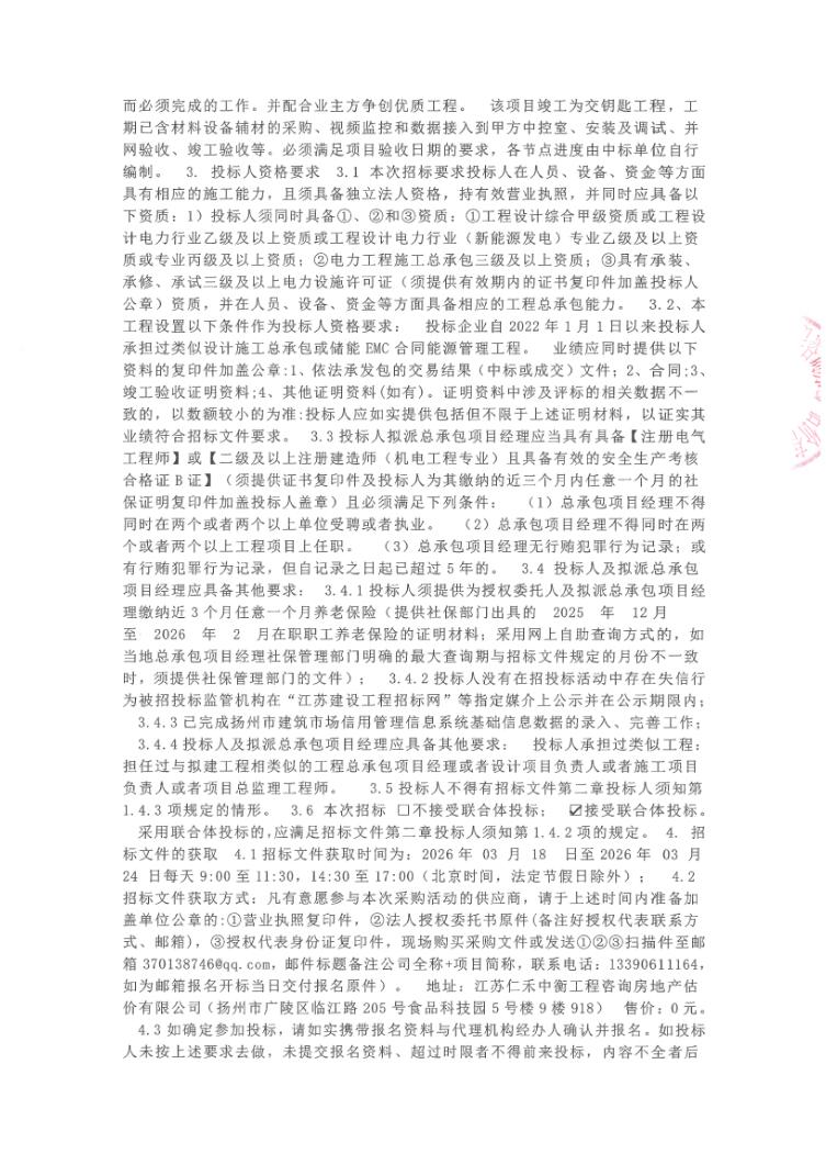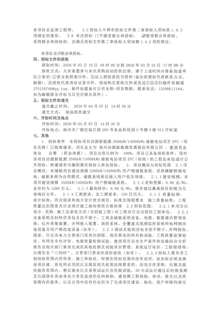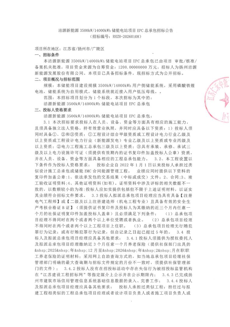 3月17日,洁源新能源3500kW/14000kWh储能电站项目EPC总承包招标通知布告发布。