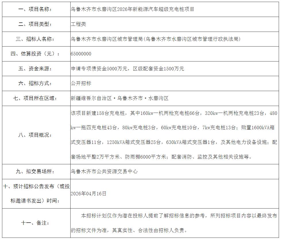 近日,新疆乌鲁木齐市水磨沟区2026年新能源汽车超等充电桩项目招标规划发布。 据通知布告显示,该项目估算投资6500万元,该项目新建158台充电桩,此中160kw一机两枪充电桩66台,320kw一机两枪充电桩23台,480kw一拖四充电桩43台,80kw充电桩3台,60kw充电桩10台,7kw充电桩13台;购置1600kVA箱式变压器11台,1250kVA箱式变压器25台,630kVA箱式变压器1台,和其他电力装备举措措施;配套园地平整2万平方米、防雨棚6000平方米;配套消防、监控和其他相干举措措施等。 原文件以下: