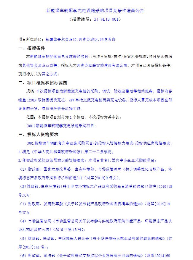 近日,新疆阿克苏市新能源车辆配套充电举措措施采购项目竞争性商量通知布告发布。 该项目位在新疆维吾尔族自治区阿克苏市,本次招标项目为新能源充电桩的采购、调试、验收和售后等相干办事,招标内容涵盖120KW双枪直流快充桩、7KW 单枪交流充电桩两类充电装备,投标人需完成本项目全数装备的供货、质保办事等全流程事情。 本招标项目划分为1个标段,本次招标为此中的:(001)新能源车辆配套充电举措措施采购项目。 原文以下:
