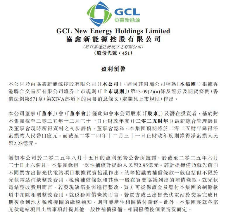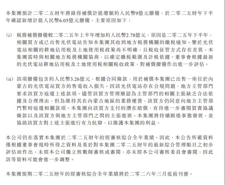 3月15日,协鑫新能源发布盈利預警通知布告。 通知布告显示,协鑫新能源2025年吃亏11亿元。对于在吃亏缘故原由,协鑫新能源注释缘故原由之一为计提9亿元。 此中,税务赔偿拨备较二零二五年上半年增长约人平易近币2.78亿元,缘故原由是二零二五年下半年,相干买方或者已经出售光伏电站奉告本集团其收到处所税务机关的缴税通知。鉴在光伏电站相干的耕地占用税和地盘利用税政策尚不明确,且税收征管方式存于差异,本集团需时与相干处所税务机关协商,以确定缴税规模和计税依据。董事会按照最新的光伏电站耕地占用税和地盘利用税相干税收政策,对于赔偿拨备作出进一步评估。 该项拨备包罗约人平易近币3.26亿元,按照合同条目,用在赔偿本集团已经出售一坐位在内蒙古的光伏电站买方的售电收入丧失。因该光伏电站存于合规问题,处所主管部分要求该买方返还有上述金钱。只管该买方治理层认为主管部分的相干主意缺少正当依据和合理理由,但为维持其于内蒙古地域的营业运营,该买方仍赞成向处所主管部分暂时返还有相干金钱。本集团向该买方付出的潜于补偿,有待进一步审视生意和谈条目以和该买方与处所主管部分之间的主意进展。本集团将连续跟进事态成长,并协助该买方对于上述主意举行有力抗辩,以维护本集团的好处。