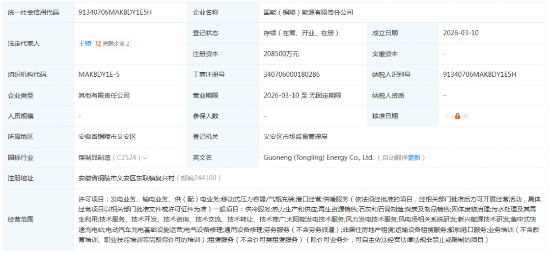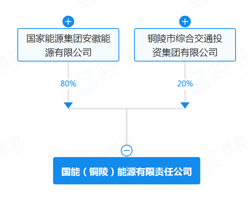 光伏头条获悉,企查查显示,3月10日,国能(铜陵)能源有限责任公司建立,注册本钱20.85亿元,谋划规模包括太阳能发电技能办事;风力发电技能办事;风电场相干体系研发;新兴能源技能研发;集中式快速充电站;电动汽车充电基础举措措施运营等。 股权穿透图显示,该企业由国度能源集团安徽能源有限公司(80%)及铜陵市综合交通投资集团有限公司(20%)配合持股,前者为国度能源集团子公司。 来历:企查查