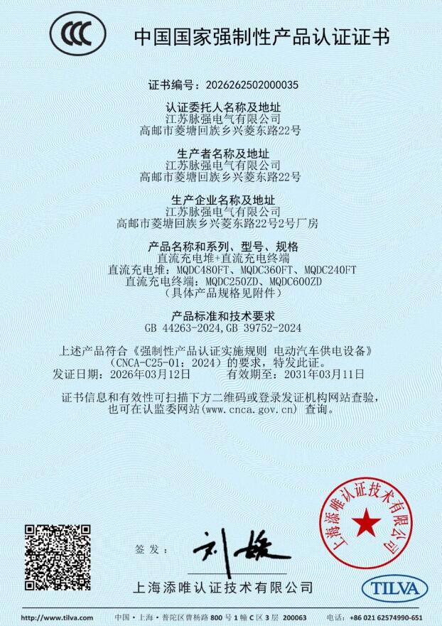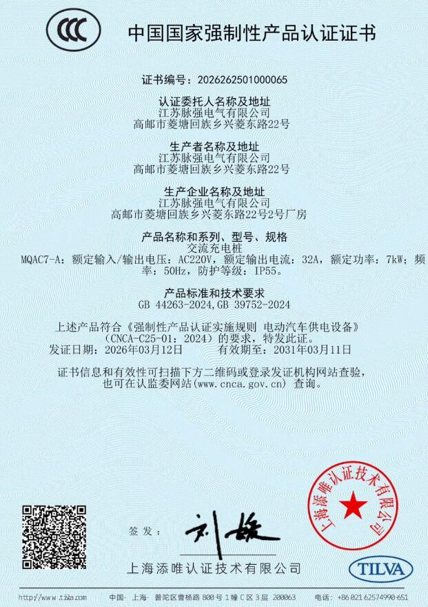 近日,脉强电气公布,公司出产的脉强新能源汽车充电桩已经正式得到国度强迫性产物认证(CCC认证),标记着脉强新能源于充电装备范畴的合规性与安全性得到国度级权势巨子承认,也为用户提供了更安全、靠得住的充电保障。 跟着我国新能源汽车财产的蓬勃成长,充电基础举措措施的安全问题日趋遭到存眷。为增强产物质量治理,掩护消费者人身安全,国度市场监视治理总局发布划定,明确自2026年8月1日起,未得到CCC认证证书及标注认证标记的电动汽车供电装备,不患上出厂、发卖、入口或者于其他谋划勾当中利用。这一举措标记着充电装备正式进入强迫认证时代,行业门坎与安全尺度周全晋升。 脉强电气这次顺遂经由过程CCC认证,象征着产物于电气安全、电磁兼容、机械机能、情况顺应性等焦点维度均到达了国度尺度要求。这不仅是对于脉强电气技能研发实力与质量治理系统的周全查验与必定,更彰显了企业对于用户安全高度卖力的立场。 脉强电气相干卖力人暗示:“得到CCC认证不是尽头,而是构建新型安全生态的出发点。将来,脉强电气将连续深耕充电技能,严守质量生命线,以更智能、更安全、更高效的充电产物,助力新能源汽车财产高质量成长,为每一一名用户的绿色出行保驾护航。”