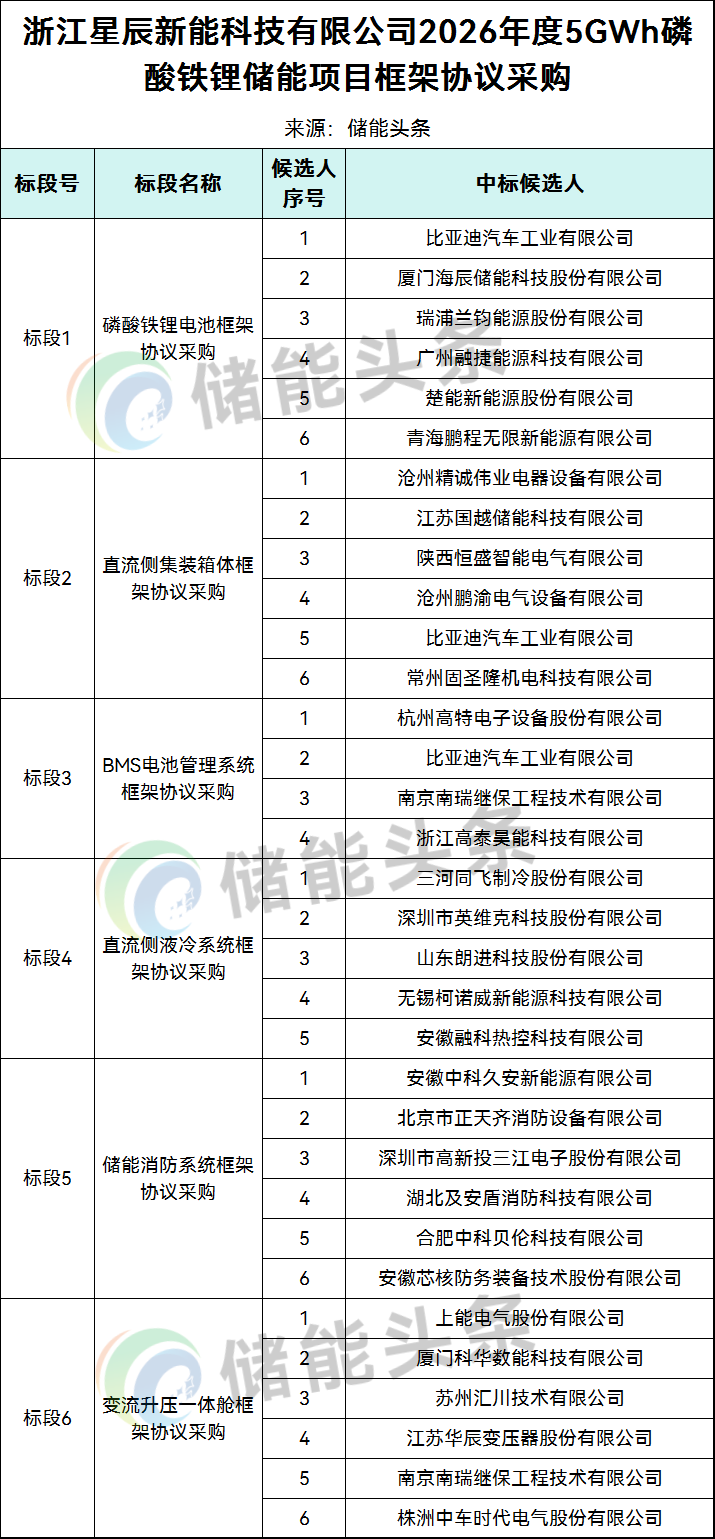 储能头条获悉,3月11日,浙江星斗新能科技有限公司2026年度5GWh磷酸铁锂储能项目框架和谈采购中标候选人公示。 本招标项目划分6个标段。 标段1:磷酸铁锂电池框架和谈采购 比亚迪汽车工业有限公司、厦门海辰储能科技株式会社、瑞浦兰钧能源株式会社、广州融捷能源科技有限公司、楚能新能源株式会社、青海鹏程无穷新能源有限公司入围。 标段2:直流侧集装箱体框架和谈采购。 沧州精诚伟业电器装备有限公司、江苏国越储能科技有限公司、陕西恒盛智能电气有限公司、沧州鹏渝电气装备有限公司、比亚迪汽车工业有限公司、常州固圣隆电机科技有限公司入围。 标段3:BMS电池治理体系框架和谈采购 杭州高特电子装备株式会社、比亚迪汽车工业有限公司、南京南瑞继保工程技能有限公司、浙江高泰昊能科技有限公司入围。 标段4:直流侧液冷体系框架和谈采购 三河同飞制冷株式会社、深圳市英维克科技株式会社、山东朗进科技株式会社、无锡柯诺威新能源科技有限公司、安徽融科热控科技有限公司入围。 标段5:储能消防体系框架和谈采购 安徽中科久安新能源有限公司、北京市正天齐消防装备有限公司、深圳市高新投三江电子株式会社、湖北和安盾消防科技有限公司、合肥中科贝伦科技有限公司、安徽芯核防务设备技能株式会社入围。 标段6:变流升压一体舱框架和谈采购 上能电气株式会社、厦门科华数能科技有限公司、姑苏汇川技能有限公司、江苏华辰变压器株式会社、南京南瑞继保工程技能有限公司、株洲中车时代电气株式会社入围。 本招标项目划分6个标段: 标段1:磷酸铁锂电池框架和谈采购 标段2:直流侧集装箱体框架和谈采购 标段3:BMS电池治理体系框架和谈采购 标段4:直流侧液冷体系框架和谈采购 标段5:储能消防体系框架和谈采购 标段6:变流升压一体舱框架和谈采购 (详见前文:5GWh!星斗新能2026年度磷酸铁锂储能项目框采招标!) 标段1:磷酸铁锂电池框架和谈采购 自2025年1月1日至投标截止时间前(以合同签署时间为准),投标人必需具备磷酸铁锂电池(不小在314Ah容量)供货总量累计不低在2GWh的合同事迹。 本标段不接管结合体投标。 标段2:直流侧集装箱体框架和谈采购 自2024年1月1日至投标截止时间前(以合同签署时间为准),投标人必需具备直流侧集装箱体(合用在单舱≥5MWh直流侧体系)供货总量累计不低在200套的合同事迹。 本标段不接管结合体投标。 标段3:BMS电池治理体系框架和谈采购 自2024年1月1日至投标截止时间前(以合同签署时间为准),投标人必需具备储能BMS电池治理体系(合用在单舱≥5MWh的直流侧体系)供货总量累计不低在4GWh的合同事迹。 本标段不接管结合体投标。 标段4:直流侧液冷体系框架和谈采购 自2024年1月1日至投标截止时间前(以合同签署时间为准),投标人必需具备液冷体系(合用在单舱≥5MWh的直流侧体系)供货总量累计不低在2GWh的合同事迹。 本标段不接管结合体投标。 标段5:储能消防体系框架和谈采购 自2025年1月1日至投标截止时间前(以合同签署时间为准),投标人必需具备储能消防体系(合用在单舱≥5MWh直流侧电池体系)供货总量累计不低在2GWh的合同事迹。 本标段不接管结合体投标。 标段6:变流升压一体舱框架和谈采购 自2024年1月1日至投标截止时间前(以合同签署时间为准),投标人必需具备变流升压一体舱(单舱≥2.5MW)供货总量累计不低在2GW的合同事迹。 本标段不接管结合体投标。 原文以下: 浙江星斗新能科技有限公司2026年度5GWh磷酸铁锂储能项目框架和谈采购中标候选人公示 (JSTCC26003100007) 发布日期: 2026-03-11 发布前言: 江苏省招标投标大众办事平台 来历渠道: 江苏招标JSTCC 公示最先时间:2026-3-11 公示竣事时间:2026-3-16 1、评标环境 标段1:磷酸铁锂电池框架和谈采购(JSTCC26003100007-1): 一、中标候选人基本环境 中标候选人第1名:比亚迪汽车工业有限公司,质量:满意招标文件要求,交货期:满意招标文件要求; 中标候选人第2名:厦门海辰储能科技株式会社,质量:满意招标文件要求,交货期:满意招标文件要求; 中标候选人第3名:瑞浦兰钧能源株式会社,质量:满意招标文件要求,交货期:满意招标文件要求; 中标候选人第4名:广州融捷能源科技有限公司,质量:满意招标文件要求,交货期:满意招标文件要求; 中标候选人第5名:楚能新能源株式会社,质量:满意招标文件要求,交货期:满意招标文件要求; 中标候选人第6名:青海鹏程无穷新能源有限公司,质量:满意招标文件要求,交货期:满意招标文件要求; 二、中标候选人相应招标文件要求的资历能力前提 中标候选人(比亚迪汽车工业有限公司)的资历能力前提:满意招标文件要求; 中标候选人(厦门海辰储能科技株式会社)的资历能力前提:满意招标文件要求; 中标候选人(瑞浦兰钧能源株式会社)的资历能力前提:满意招标文件要求; 中标候选人(广州融捷能源科技有限公司)的资历能力前提:满意招标文件要求; 中标候选人(楚能新能源株式会社)的资历能力前提:满意招标文件要求; 中标候选人(青海鹏程无穷新能源有限公司)的资历能力前提:满意招标文件要求; 标段2:直流侧集装箱体框架和谈采购(JSTCC26003100007-2): 中标候选人第1名:沧州精诚伟业电器装备有限公司,质量:满意招标文件要求,交货期:满意招标文件要求; 中标候选人第2名:江苏国越储能科技有限公司,质量:满意招标